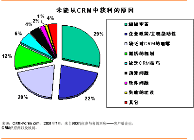 但成功只會擁抱那些能夠“正確執(zhí)行”的人,而不是任何一個搭上CRM順風船的企業(yè)。2001年7月,CRM-Forum.com出版了一份關于未能從CRM中獲利原因的報告。從搜集到的來自CRM開拓者的約900個回應來看——客戶端企業(yè),CRM供應商以及顧問,組織變革及企業(yè)政策/主觀能動性占了50%以上的失敗原因;緊隨其后的各個因素包括缺乏對CRM的理解(20%)和糟糕的規(guī)劃(12%)。下面讓我們就CRM方法論的選擇對這些因素作一番考察吧。
