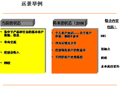 在評估當前情況與遠景,資源需求,癥結(jié),極限以及鋪就路標和里程碑的關系時,實施展望和差距分析會議是十分重要的。取決于你對CRM遠景的定義——無論是它將成為一個能夠給你一把競爭利刃的企業(yè)策略 (類似的例子有Citicorp,Dell,F(xiàn)ord Motors) 或僅僅只是一個讓你更出眾的營銷項目——這邁出的第一步在你選擇CRM方法論的過程中都必將起到舉足輕重的作用。一個核心的方法論必須能夠支持企業(yè)大部分的業(yè)務和流程需求,如MIS;客戶體驗管理;接觸點管理;收益率管理等等。