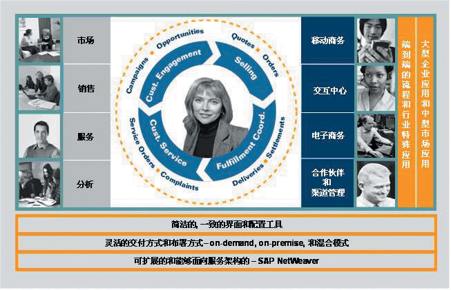 mySAP CRM不僅包含了企業(yè)市場(chǎng)營銷、銷售、服務(wù)、分析等功能,還通過渠道伙伴、現(xiàn)場(chǎng)和移動(dòng)商務(wù)、交互中心、電子商務(wù)等各種交互渠道形成完整的閉環(huán)式設(shè)計(jì)的解決方案。在提供深入的行業(yè)應(yīng)用和傳統(tǒng)的部署方式的同時(shí),mySAP