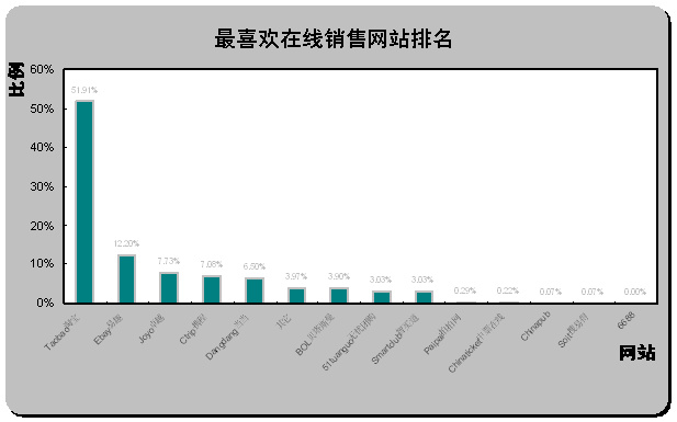 易趣中國(guó)和貝塔斯曼最不受歡迎。從最不喜歡在線銷售網(wǎng)站排名(如上圖)可以看出,易趣中國(guó)eBay