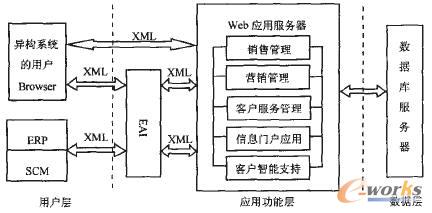 包括ERP、SCM等其他企業(yè)應用在內(nèi)的所有的系統(tǒng)用戶與應用功能層的數(shù)據(jù)交換均通過XMI數(shù)據(jù)進行傳輸,從而大大減小了各種企業(yè)應用系統(tǒng)間的通信阻力,為EAI提供了良好的通信平臺。Web用戶的客戶端只是“瘦小的”瀏覽器日_數(shù)量不受限制,不需要安裝專門的軟件,這使得凡可以接入Internet的用戶都可以方便、靈活地使用系統(tǒng),大大提升了系統(tǒng)用戶間溝通、協(xié)作的效率。此外,由于CRM應用系統(tǒng)是在中央服務器上實施和維護的,對客戶端的要求遠沒有C/S結構那么高,集中的軟件實施和維護大大節(jié)約了企業(yè)的運行成本和維護費用。圖1描述的是筆者所要闡述的適應網(wǎng)絡環(huán)境的基于Web的系統(tǒng)平臺架構,這并不意味著CRM應用系統(tǒng)完全以這種方式運行,事實上用戶接入CRM系統(tǒng)的方式是多種多樣的,系統(tǒng)還應該提供電話、傳真、無線接入等多種接入接口。
