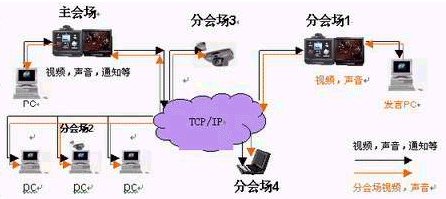 可視化Ip電話會議系統(tǒng): 是利用計算機,多媒體通信技術(shù)和設備,通過傳輸信道在兩地或多個地點之間開會的一種通信手段。在召開會議時,處于兩地或不同地點的與會代表,既可以聽到對方的聲音,又可以看到對方的形象,同時還能看到對方會議室的場景,以及在會議中展示的事物、圖片、表格、文件等,縮短了與會代表的距離,使大家好像在同一會議室參加會議一樣。它的廣泛應用必然產(chǎn)生巨大的社會效益和經(jīng)濟效益。系統(tǒng)結(jié)構(gòu)簡圖如下: