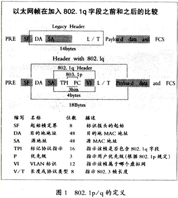 Identifier,虛擬網(wǎng)標(biāo)識)位識別傳送的幀究竟屬于哪一個虛網(wǎng)。VI位共有12位,最大可以支持的虛網(wǎng)個數(shù)不會超過4096個。 802.1p/q的具體定義可以參見圖1。