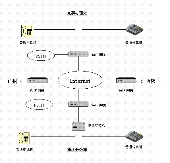 有一家臺商公司,在臺灣、東莞、廣州和重慶自己的分支機構,相互之間有大量的通話聯(lián)系,特別是研發(fā)部門,其通話量更是非常大。因此試圖在各個地方之間使用IP電話來降低通訊支出。在實施IP電話服務之前,各個地方都擁有完善的局域網(wǎng),并且申請了固定IP的寬帶接入。并且在辦公室內(nèi)部署了程控電話交換機。