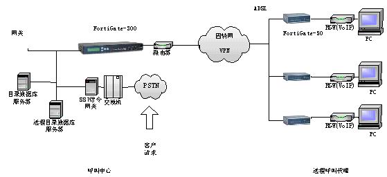 呼叫中心和代理之間傳輸可以選用寬帶高速ADSL網(wǎng)絡(luò),構(gòu)成以一個(gè)呼叫中心和眾多遠(yuǎn)端通信的綜合語(yǔ)音/數(shù)據(jù)VPN網(wǎng)絡(luò)。VoIP/Data ADSL VPN網(wǎng)絡(luò)是呼叫系統(tǒng)的解決辦法,它要求系統(tǒng)的性能好,穩(wěn)定性和可靠性高,語(yǔ)音質(zhì)量好, 響應(yīng)時(shí)間短,網(wǎng)絡(luò)配置和維護(hù)簡(jiǎn)單方便。