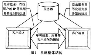 通過設置一個信令服務器的方式綜合以上兩種方式的優(yōu)缺點。用戶通話程序工作于半客戶機狀態(tài),信令服務器負責客戶的集中呼叫。當某一個客戶呼叫,服務器負責中轉(zhuǎn)呼叫,當被叫客戶響應呼叫并應答后,自主于呼叫方進行通話而不必經(jīng)過信令服務器,這樣,大幅度地減少了服務器的數(shù)據(jù)量。有了集中的信令服務器,也便于客戶的管理,還可進行廣播消息的發(fā)布。