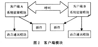 如圖2所示,客戶端由2個主要模塊組成:系統(tǒng)駐留模塊、語音通訊模塊。