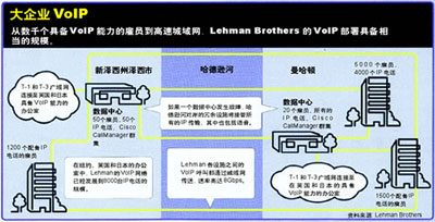 Lehman Brothers利用Cisco CallManager IP PBX向全球的雇員提供語(yǔ)音服務(wù)。該公司的IP PBX位于公司在曼哈頓和新澤西城的冗余數(shù)據(jù)中心內(nèi)。公司從2001年初先期部署了容量為50部電話的VoIP網(wǎng)絡(luò)。該系統(tǒng)在當(dāng)年年中時(shí)已經(jīng)增容至1000個(gè)用戶。目前,這套VoIP網(wǎng)絡(luò)已經(jīng)增加至8000個(gè)IP電話,用戶遍及紐約地區(qū)、英國(guó)和日本。該公司負(fù)責(zé)網(wǎng)絡(luò)服務(wù)的副總裁John