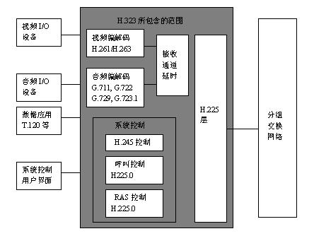 為網(wǎng)絡(luò)電話和可視電話會(huì)議系統(tǒng)的進(jìn)一步發(fā)展和系統(tǒng)的兼容性提供了良好的條件。其中系統(tǒng)控制協(xié)議包括H.323、H.245、和H.225.0,Q.931和RTP/RTCP是H.225.0的主要組成部份。系統(tǒng)控制是H.323終端的核心。整個(gè)系統(tǒng)控制由H.245控制信道、H.225.0呼叫信令信道和RAS(注冊(cè)、許可、狀態(tài))信道提供,音頻編解碼協(xié)議包括G.711協(xié)議(必選)、G.722、G.723.1、G.728、G.729等協(xié)議。編碼器使用的音頻標(biāo)準(zhǔn)必須由H.245協(xié)議協(xié)商確定。H.323終端應(yīng)由對(duì)本身所具有的音頻編解碼能力進(jìn)行非對(duì)稱操作。如以G.711發(fā)送,以G.729接收。視頻編解碼協(xié)議主要包括H.261協(xié)議(必選)和H.263協(xié)議。H.323系統(tǒng)中視頻功能是可選的。數(shù)據(jù)會(huì)議功能也是可選的,其標(biāo)準(zhǔn)是多媒體會(huì)議數(shù)據(jù)協(xié)議T.120。其結(jié)構(gòu)如圖所示。