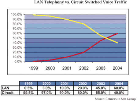 Group的資料顯示,LAN Telephone與Circuit Switched Voice Traffic比較圖,呈現(xiàn)數(shù)據(jù)網(wǎng)絡(luò)的占有率將在二至三年后,首度超越語(yǔ)音網(wǎng)絡(luò)的流量占有率。因此,不論是盤據(jù)傳統(tǒng)電信市場(chǎng)大廠如Lucent及Nortel,或是代表網(wǎng)絡(luò)新興勢(shì)力的Cisco,也都在積極爭(zhēng)搶這塊新領(lǐng)域的主導(dǎo)權(quán)。于是,有人說(shuō),「IP