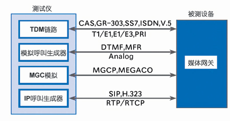 我們按照VoIP組網(wǎng)的原理,構(gòu)建了這樣一個(gè)基本網(wǎng)絡(luò),其網(wǎng)絡(luò)結(jié)構(gòu)如圖4所示。我們用軟交換的概念來描述網(wǎng)絡(luò)上的設(shè)備,在這個(gè)網(wǎng)絡(luò)上,MG(媒體網(wǎng)關(guān))和MGC(媒體網(wǎng)關(guān)控制器)是關(guān)鍵的VoIP網(wǎng)絡(luò)元素。這些網(wǎng)絡(luò)元素可以是支持H.323、MGCP、H.248或者SIP的實(shí)體。本文中提到的MG和MGC不具體指某一個(gè)設(shè)備,本次測(cè)試正是針對(duì)這兩類設(shè)備進(jìn)行,測(cè)試的主要內(nèi)容也圍繞著這兩類設(shè)備展開。測(cè)試從模擬話音開始,然后延伸到PSTN網(wǎng)絡(luò),再到IP網(wǎng)絡(luò),最后回到模擬話機(jī)的被叫方。在這樣一個(gè)完整通話過程中,測(cè)試MG以及MGC的信令互操作性以及設(shè)備處理信令的能力。圖5是測(cè)試系統(tǒng)結(jié)構(gòu)原理圖。