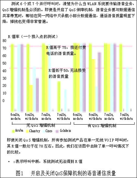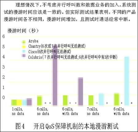 但我們這樣做是合理的。首先,Chantry和Colubris的設(shè)備甚至在建議內(nèi)的6個(gè)并行VoIP呼叫情況下,也無法正常通話。第二,Aruba的設(shè)備能夠處理7個(gè)并行VoIP呼叫并能適應(yīng)加入數(shù)據(jù)流業(yè)務(wù)的情況。第三,我們最有難度的試驗(yàn)也遠(yuǎn)低于無線傳輸媒介的最大負(fù)載。我們試驗(yàn)通常低于3Mbps的通信傳輸速度(包括試驗(yàn)中的所有語音和數(shù)據(jù)業(yè)務(wù)),更遠(yuǎn)低于無線信道的容量了?傊琕oWLAN系統(tǒng)可以實(shí)現(xiàn)在單接入點(diǎn)承載7個(gè)并行VoIP呼叫并加入數(shù)據(jù)通信業(yè)務(wù),但要做到這一點(diǎn)需要更完善的系統(tǒng)設(shè)計(jì)和產(chǎn)品性能。