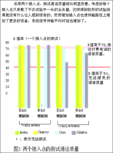 而其他供應(yīng)商的設(shè)備在開啟QoS保障機(jī)制的情況下,一旦加入數(shù)據(jù)流業(yè)務(wù),就很難保證通話質(zhì)量。從正面來看,在只有語音傳輸業(yè)務(wù)的情況下,QoS保障機(jī)制一般運(yùn)行較好。當(dāng)我們只承載語音傳輸時(shí),所有系統(tǒng)的音頻質(zhì)量都改善了。在不加入數(shù)據(jù)流情況下測試6個(gè)或7個(gè)并行VoIP呼叫,所有的系統(tǒng)都能夠取得和付費(fèi)電話一樣的通話質(zhì)量。但當(dāng)我們加入數(shù)據(jù)流業(yè)務(wù),一切都改變了。在承載6個(gè)并行VoIP呼叫并加入數(shù)據(jù)流業(yè)務(wù)的情況下,Colubris CN1250系統(tǒng)的R值衰落到70以下。根據(jù)ITU的R值標(biāo)準(zhǔn),這說明一些用戶的通話質(zhì)量不令人滿意。Chanrty的R值在60左右,這個(gè)結(jié)果將不能令用戶滿意。除了客觀的R值評分以外,我們還進(jìn)行了一些主觀的通信質(zhì)量監(jiān)聽,當(dāng)加入了數(shù)據(jù)流業(yè)務(wù)以后,我們聽到了大量的回聲,掉線頻繁?傊,只要測試點(diǎn)加入數(shù)據(jù)業(yè)務(wù)流,上面描述的情況就會(huì)出現(xiàn),通話質(zhì)量通常變得惡劣。