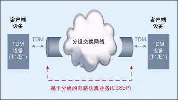 CESoP的基本思想就是在分組交換網(wǎng)絡上搭建一個“通道”,在其中實現(xiàn)TDM電路(如T1或E1),從而使網(wǎng)絡任一端的TDM設備不必關心其所連接的網(wǎng)絡是否是一個TDM網(wǎng)絡。分組交換網(wǎng)絡被用來仿真TDM電路的行為,故而稱為“電路仿真”(圖1)。