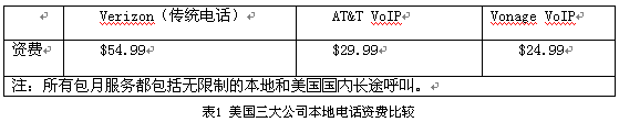隨著寬帶接入的進一步普及,VoIP似乎為打破本地環(huán)路的瓶頸提供了新的選擇,AT&T、Qwest、時代華納、Verizon等老牌運營商紛紛開始提供這項服務(wù)。AT&T于2004年3月在新澤西州和德克薩斯州推出了29.99美元的包月計劃,其VoIP業(yè)務(wù)不僅包含了基本語音服務(wù),也提供諸如呼叫轉(zhuǎn)移、會議電話、來電顯示等增值服務(wù),美國三大公司本地電話資費如表1所示。