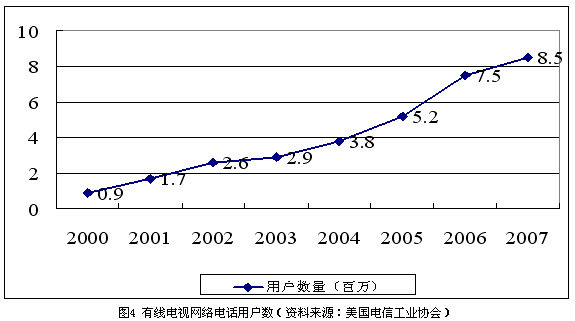 隨著有線電視用戶數(shù)量逐漸達到飽和,有線電視公司也在積極尋找新的利潤增長點。在過去的7年中,有線電視公司投入了高達800億美元的資金用于網(wǎng)絡(luò)升級改造,現(xiàn)在,大部分有線電視網(wǎng)絡(luò)已經(jīng)可以提供包括寬帶接入、本地和長途電話、數(shù)字電視、視頻點播等在內(nèi)的一攬子服務(wù)。到2004年末,有線電視公司已經(jīng)擁有超過380萬的本地電話用戶。根據(jù)美國電信工業(yè)協(xié)會的估算,到2007年,全美將會有超過800萬的用戶選擇基于有線電視網(wǎng)的基本電信業(yè)務(wù),如圖4所示。