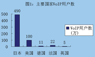 目前全球VoIP市場已經(jīng)形成,明顯的市場劃分也已出現(xiàn)。截至2004年底,日本共擁有VoIP用戶490萬,美國100萬,德國11萬,法國22萬,英國5萬 (如圖1所示)。根據(jù)Insight Research的調(diào)查,全球VoIP市場收入將在2005年達(dá)到820億美元,在2007年達(dá)到1965億美元,其中大部分增長是由商業(yè)用戶驅(qū)動的。