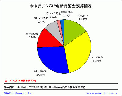 iResearch艾瑞市場(chǎng)咨詢(xún)2005年7月發(fā)布的《2005年中國(guó)VOIP市場(chǎng)研究報(bào)告》(以下簡(jiǎn)稱(chēng)《VOIP報(bào)告》)統(tǒng)計(jì)結(jié)果顯示,用戶(hù)對(duì)網(wǎng)絡(luò)電話(huà)有著較高熱情,預(yù)計(jì)未來(lái)網(wǎng)絡(luò)電話(huà)平均月消費(fèi)預(yù)算為40元。