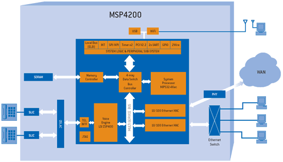 PMC-Sierra VoIP WiFi寬帶路由器方案的核心是MSP4200(見圖),MSP4200支持一個(gè)基于DSP的語音引擎,使得該MIPS處理器在管理、信令和高速IP路由任務(wù)中可發(fā)揮出最佳性能。這種架構(gòu)確保了相當(dāng)于固定線路快速以太網(wǎng)路由速度以及防火墻性能,并能同時(shí)在四個(gè)通道提供VoIP服務(wù)。另外它還有一個(gè)PCI接口以提供更多靈活性,支持各種802.11 WiFi芯片組和其它外圍設(shè)備。
