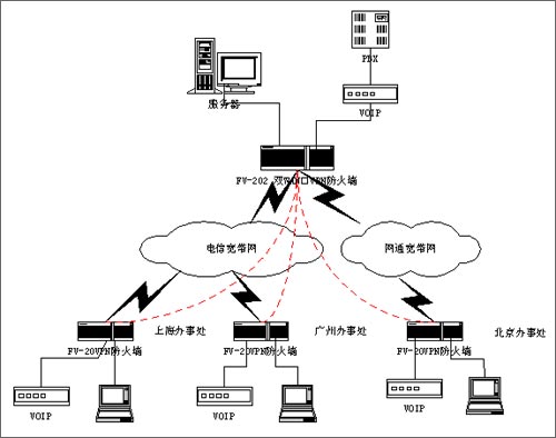 VPN防火墻網關具有雙WAN口和QOS帶寬管理功能,總部同時接入兩條ADSL線路,通過策略路由,把內部網絡的上網訪問全部從WAN2的ADSL上網,而把VOIP和VPN全部通過WAN1的ADSL來傳輸,從而避免了上網的請求占用VPN和VOIP的帶寬。同時,通過對內部網絡不同的業(yè)務劃分不同的優(yōu)先級,特別是把VOIP的優(yōu)先級做為最高,優(yōu)先轉發(fā)VOIP的數據包,同時又通過VOIP和VPN傳輸分配最大和最小的保證帶寬,來保護VOIP業(yè)務的正常通信。除此之外,FV-202強大的訪問控制功能,特別是對VPN隧道的訪問控制功能,可以對各地的分公司通過VPN訪問總公司的服務器進行控制,為不同的客戶分配不同的權限,讓遠程的VPN隧道只能訪問指定的IP地址或相關的業(yè)務端口,能很好保證VPN的訪問安全。特別值得一提的是,FV-202支持網通、電信雙線路接入,如果由于北方網通跨網接入,可以在全部申請網通線路,把北方的分支機構接入到總部的網通線路,可以避免由于跨網帶來的帶寬瓶頸。在各個分支機構配置iRouter的FV-20VPN防火墻,為各個分支機構構建一道安全的防線,實現與總部的VPN的聯(lián)接。同時,外出的員工或領導通過IPSEC的撥號軟件,實現移動的接入,通過VPN,東莞奧愛斯構建全國的融合的安全通信平臺,既可以解決VOIP的被竊聽的風險,又能實現實時的數據訪問。從而大大地降低公司長途的話費和以往租用數據專線的高昂的費用,提高了公司的工作效率,為公司帶來十分明顯的經濟效益。