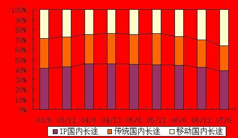 從圖中可以看出,IP電話的相對(duì)快速增長(zhǎng)在一定程度上對(duì)傳統(tǒng)長(zhǎng)途電話形成了替代作用,但近年來自于移動(dòng)長(zhǎng)途的替代作用更明顯。從占比上來看,2007年上半年,IP國(guó)內(nèi)長(zhǎng)途電話占全部國(guó)內(nèi)長(zhǎng)途通話量38.3%,超過移動(dòng)長(zhǎng)途電話的35.9%和傳統(tǒng)長(zhǎng)途電話的25.8%,仍然是長(zhǎng)途電話的主流。