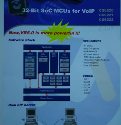 網(wǎng)關(guān)器及IP PBX應(yīng)用的市場的產(chǎn)品包括CS6209、CS6220、CS6221、CS6222、CS6223等,并提供了非常完善的解決方案。為了更好的服務(wù)于大陸客戶,目前,世紀民生在大陸的深圳、武漢和上海都設(shè)有分公司,并且在各分公司之間已經(jīng)在穩(wěn)定的使用VoIP來進行溝通。