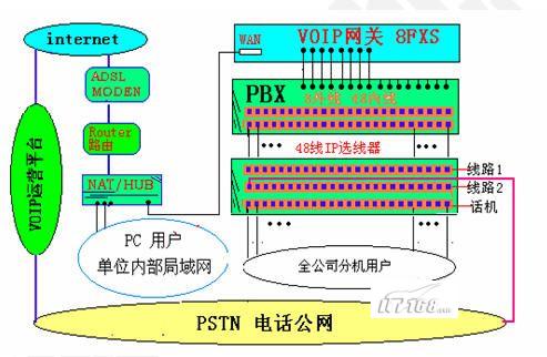 建議采用“EIA2000系列語音網(wǎng)關(guān)”,有單口、2口、4口、8口、16口等設(shè)備,可供選擇。所謂4口,即每設(shè)備有4個通訊接口,可4路同時通話,公司內(nèi)部電話通過集團(tuán)交換機接入語音網(wǎng)關(guān),且可新增網(wǎng)關(guān)自由擴展。端口建議選擇全FXS口接入,每路雙向通話需要占用大約10-12KB,在實際使用中,每條ADSL線路可供10路同時通話,實現(xiàn)多人共享使用(在沒有大量數(shù)據(jù)傳輸?shù)那闆r下)。