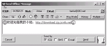 其它功能 支持界面更換,支持快捷鍵操作,可通過PtoP的方式傳送文件,支持語音交流,POP3新郵件檢查,支持直接向好友的手機(jī)發(fā)送短消息,傳呼等。