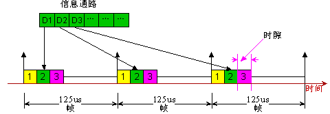 TDM就是時(shí)分復(fù)用模式。它把若干不同通道(Channel)的數(shù)據(jù)按照固定位置分配時(shí)隙(TimeSlot:8Bit數(shù)據(jù))合在一定速率的通路(Path)上。每一個(gè)時(shí)隙的速率為一個(gè)標(biāo)準(zhǔn)的PCM(Pulse-Code-Modulation)話路64Kbps。每通道時(shí)隙的重復(fù)頻率為Ts=8KHz,即幀周期為125us。如圖2所示。通常把若干通話復(fù)用在一起以后的通路組稱為一個(gè)基本群路,然后更大的通路均在此基礎(chǔ)上進(jìn)一步復(fù)用(4倍)為高次群。其中的時(shí)隙數(shù)即復(fù)用的通道數(shù)與時(shí)鐘有關(guān)。國(guó)際上有兩個(gè)不同的基群標(biāo)準(zhǔn)(PRI:Primary Rate Interface)。美國(guó)和日本采用24支路標(biāo)準(zhǔn),我國(guó)采用歐洲標(biāo)準(zhǔn),使用32路標(biāo)準(zhǔn),分別記為: