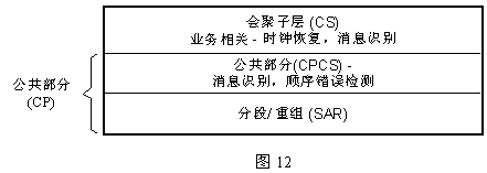 ATM適配層,是ATM核心(包括ATM層和物理層,與業(yè)務(wù)無關(guān))和高層間的接口(見圖5),它是為使ATM層能適應(yīng)不同業(yè)務(wù)類型而設(shè)置的,故ATM對(duì)各種業(yè)務(wù)承載能力集中體現(xiàn)在ATM適配層。ATM適配層又細(xì)分為若干子層。具體如下圖12。