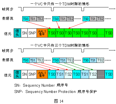 在同一個(gè)虛通道(VC)中,AAL1還支持一個(gè)或多個(gè)DS0(64Kbps)。當(dāng)虛通道中只有一個(gè)DS0話音時(shí),可以使用無結(jié)構(gòu)數(shù)據(jù)格式(UDF:Unstructured Data Format)傳送,這是一種面向比特的技術(shù);當(dāng)有多個(gè)DS0同時(shí)傳送時(shí),必須使用結(jié)構(gòu)化數(shù)據(jù)格式(SDF:Structured Data Format),此時(shí)各DS0數(shù)據(jù)流按字節(jié)依次傳送,即是面向字節(jié)的。這兩種格式的區(qū)別如下圖13所示。其中AAL1指針用于指示多DS0時(shí),第一個(gè)DS0字節(jié)位置,以便定時(shí)。利用AAL1可以實(shí)現(xiàn)ATM對(duì)STM(TDM)信號(hào)的傳送,見圖14。