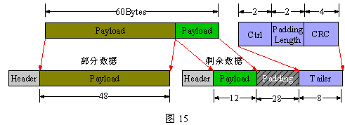 AAL5的信元格式,如下圖15所示。圖中給出了一個(gè)60字節(jié)的數(shù)據(jù)塊通過兩個(gè)ATM信元傳送的例子。