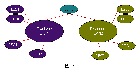 每個ELAN(Emulated LAN)由一組LANE客戶(LEC)和LANE服務構成。LEC還可以是作為ATM主機代理的網橋和路由器。LE服務由三個不同的功能實體構成:LAN仿真配置服務器(LECS)、LAN服務器(LES)和BUS,這三個服務實體可以各自存在,但通常位于同一設備,例如:LES可以位于ATM交換機、路由器、網橋和工作站。ATM LANE的構成及相互關系如下圖16所示: