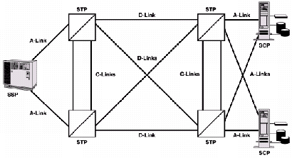 SS7提供消息傳遞以實現(xiàn)正確無誤的業(yè)務(wù)功能,如呼叫建立。因此,SS7被設(shè)計成能達到相當高的可靠性?煽啃詠碜枣溌返亩鄻有院腿哂鄠浞。圖4說明了一個簡單SS7網(wǎng)絡(luò)的標準例子,著重說明了一些內(nèi)建的可靠性特征,比如鏈路的網(wǎng)狀配置,這樣使得網(wǎng)絡(luò)中的每個信令點間都有冗余備份的鏈路,從而提高了整個網(wǎng)絡(luò)的可靠性。
