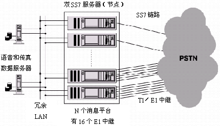 那兩個(gè)SS7節(jié)點(diǎn)是以冗余方式配置的,共享相同的信令點(diǎn)編碼,為所有的媒體節(jié)點(diǎn)提供呼叫控制。圖中所示的所有SS7鏈路采用單信令點(diǎn)編碼冗余方式備份,即使其中一個(gè) SS7節(jié)點(diǎn)出現(xiàn)故障,信令系統(tǒng)仍能繼續(xù)為呼入提供不中斷的語音信箱訪問。