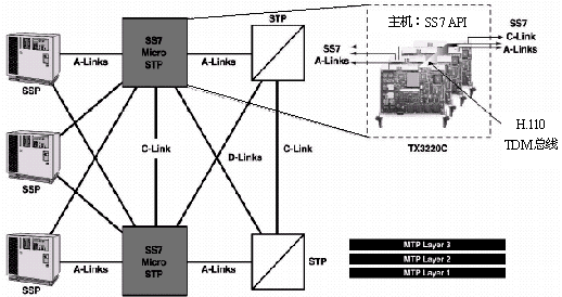 微型STP連接多條從SSP來的鏈路,并把它們集中到一個(gè)連接STP的鏈路集之中,這一鏈路集有兩條鏈路。微型STP到每個(gè)SSP也有兩條鏈路組成的一個(gè)鏈路集。微型STP由完全相同配置的一對(duì)構(gòu)成,以實(shí)現(xiàn)高可用性和高可靠性,兩個(gè)STP之間用交叉鏈路(C鏈路)相連接。另外,微型STP上的每個(gè)端口可以設(shè)置一個(gè)唯一的信令點(diǎn)編碼,以便移除SS7鏈路時(shí)不影響端點(diǎn)SSP。