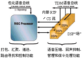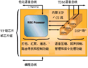 這種新型半導體元件被叫作語音處理器(VP),它不是技術創(chuàng)新成果,而只是傳統(tǒng)DSP核心和通用RISC處理器在一個或兩個硅片上的重新包裝和集成。DSP核心完成VoP的壓縮、回聲抑制和各種信號處理任務,而RISC處理器完成VoP的匯聚和打包處理。
