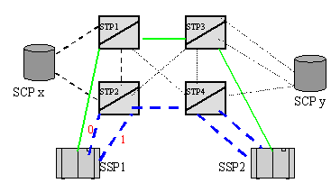 如下圖所示,藍色的五條鏈路組成SSP1到SSP2的路由1,綠色的三條鏈路組成SSP1到SSP2的路由2。路由1和路由2組成SSP1到SSP2的路由集。