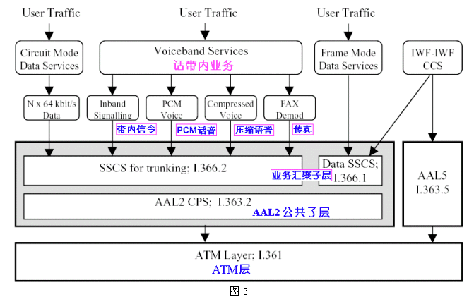 下圖2是VoATM的參考模型。其中的CTE為用戶電話終端設(shè)備,“業(yè)務(wù)接入結(jié)點”是指用戶電話業(yè)務(wù)的提供網(wǎng)絡(luò)在ATM網(wǎng)絡(luò)側(cè)的界;其中的CP-IWF完成用戶電路和ATM網(wǎng)絡(luò)的協(xié)作功能,而CO-IWF則完成ATM網(wǎng)絡(luò)和業(yè)務(wù)網(wǎng)絡(luò)的協(xié)作功能。