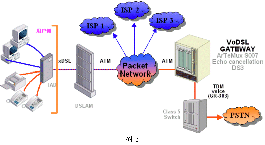 這種方式又稱為VoMBN/VoMSBN(Voice over Multi-service Broadband Network)。圖5給出了MSDN的邏輯結(jié)構(gòu)這種方式下,DSL本地環(huán)路和PSTN及Internet間的互聯(lián)不再通過(guò)Class 5交換機(jī),而由地區(qū)寬帶多業(yè)務(wù)網(wǎng)絡(luò)代替,從用戶側(cè)看仍和Class 5 交換機(jī)等效,當(dāng)其功能復(fù)雜得多。這個(gè)網(wǎng)絡(luò)可以是基于IP或ATM的,它包含信令系統(tǒng)和呼叫處理服務(wù)器及各種網(wǎng)關(guān)設(shè)備。