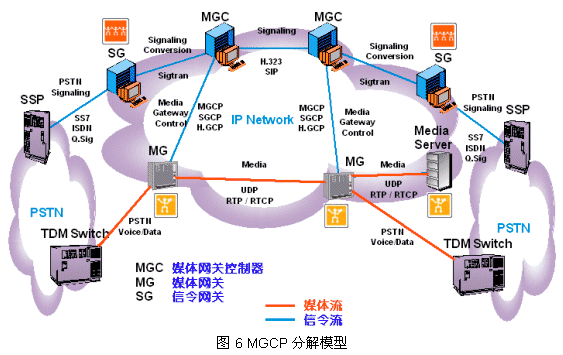 為了進(jìn)一步說明,圖6給出了MGCP協(xié)議模型的另一種表示:概念分解模型(請對(duì)照圖4、圖5)。下面介紹MGCP協(xié)議模型中最重要的協(xié)議:MGCP和SIP。