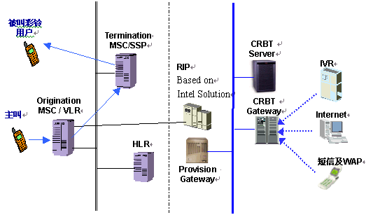 。。CRBT Gateway CRBT業(yè)務(wù)的主體——用戶,可以通過IVR、Internet、WAP或SMS-MO等手段進(jìn)行業(yè)務(wù)注冊/注銷,回鈴音定制、修改、增加等操作,而所有這些操作都是通過CRBT Gateway中間層進(jìn)行交易并由其與CRBT Server交互的。