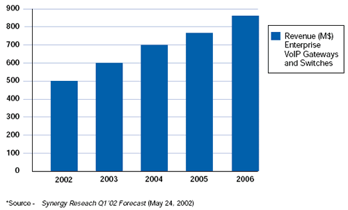 Synergy 預(yù)測(cè) "企業(yè)IP 電話 的銷售在不斷增長(zhǎng),在未來3到4年可以取代20%的傳統(tǒng)PBX的銷售". 然后, Synergy也預(yù)測(cè)VoIP網(wǎng)關(guān)和交換應(yīng)用從2002年到2006年每年會(huì)有34.6%的增長(zhǎng). 需要產(chǎn)品來把傳統(tǒng)電話交換網(wǎng)絡(luò)和IP網(wǎng)絡(luò)橋接起來. 清見圖 1.