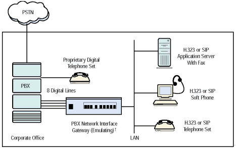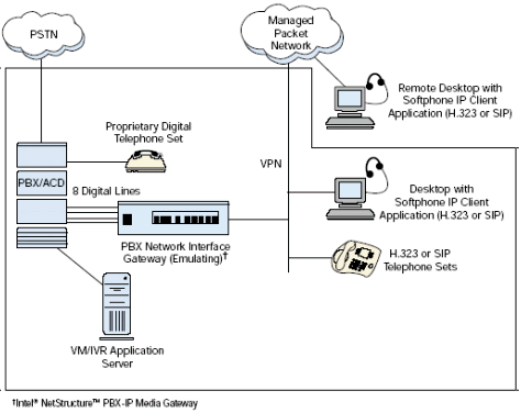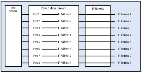 PBX-IP 媒體網(wǎng)關(guān)可以把IP電話連接到傳統(tǒng)PBX上, 給PBX集成了網(wǎng)絡(luò)應(yīng)用, 擴(kuò)展了PBX, 集成了企業(yè)局域網(wǎng)或廣域網(wǎng)語音, 傳真, 和呼叫處理能力.
