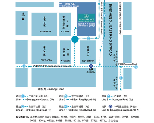 場館交通信息 名 稱:北京富力萬麗酒店 Renaissance Beijing Capital Hotel 公 交:特3路/特8外環(huán)主路/特8快車內(nèi)環(huán)/特8內(nèi)環(huán)主路/特8快車外環(huán)/特8外環(huán)/特8內(nèi)環(huán)/28路/7區(qū)間(高峰車)/37路/57路/運(yùn)通107線/214夜班/300內(nèi)環(huán) 300快車內(nèi)環(huán)/300快車外環(huán)/300外環(huán)/348路/683路/686路/707路/801路/802路/974路/976區(qū)間 雙井橋北站下車 地 鐵:10號線雙井站下
